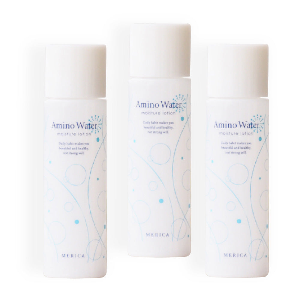 100円玉程度のアミノウォーターを手のひらに出し、頬から外側に数回なじませます。頬や目の下など顔の他の部部より乾燥しがちですので、気になる部分は数回繰り返します。アミノウォーターは、水分を蓄える肌作りに欠かせない相乗効果検証済のローションです。最新美白理論に基づき、シミができるプロセスを徹底的に防ぎます。 豊かな潤いが角層内に狙いを定めて浸透し、今までにない長時間の潤い持続実感をもたらします。
